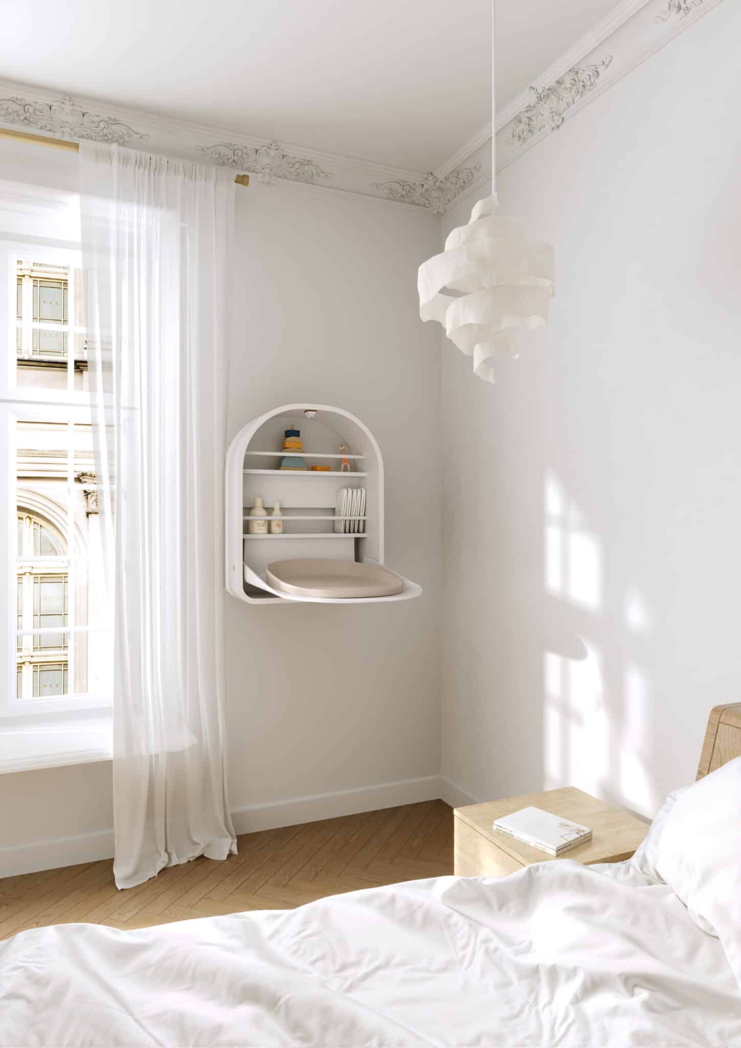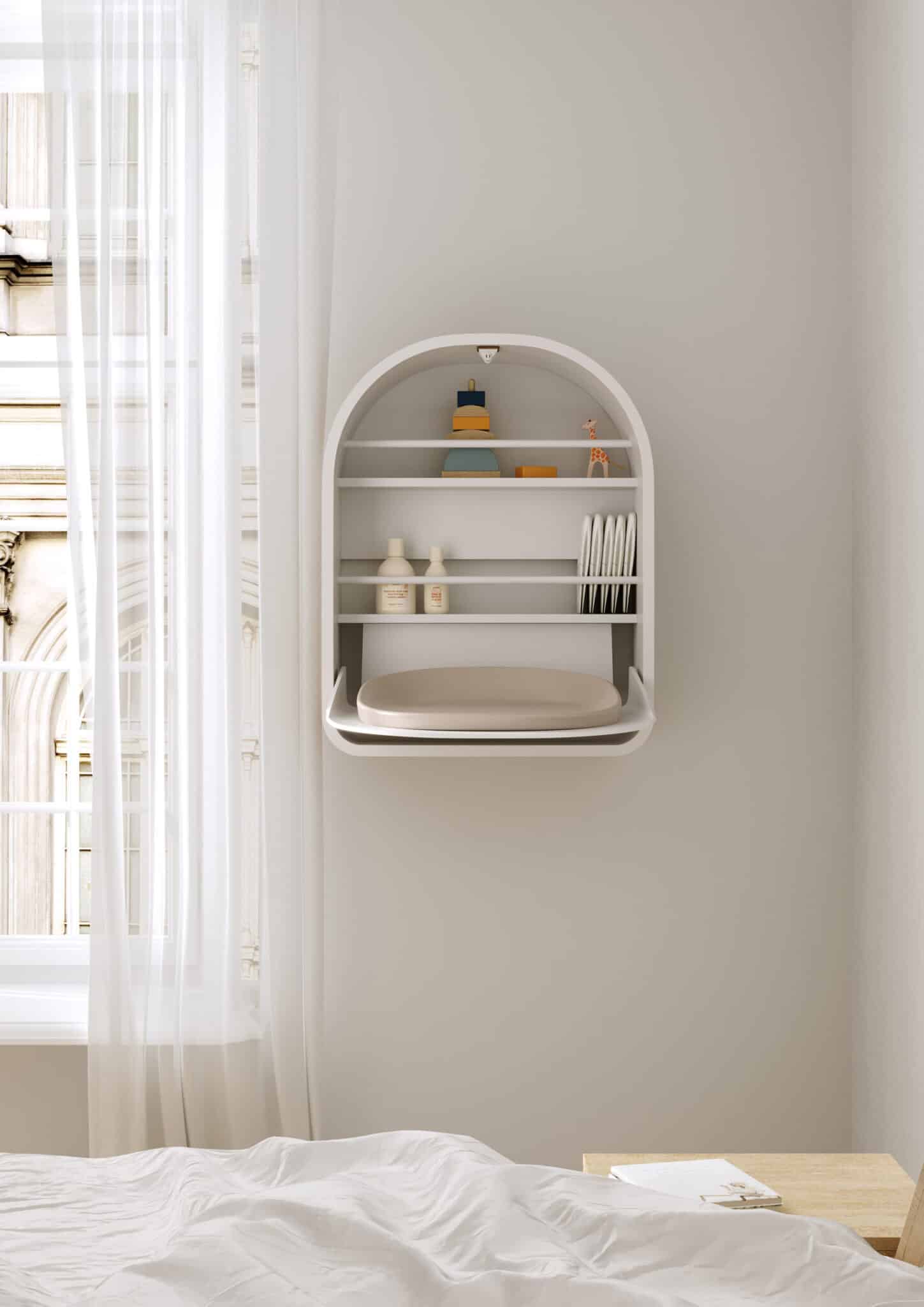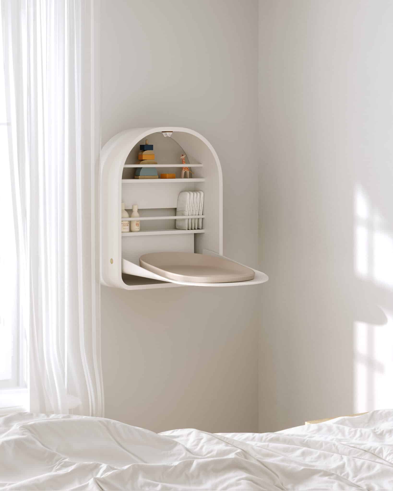 Der Wandwickeltisch Kai vereint mit seinen runden, schönen Formen Ästhetik und Funktionalität. Es eignet sich perfekt für kleinere Wohnungen und platzsparende Räume, da es sowohl Platz spart als auch eine stilvolle Note verleiht. Der Wickeltisch lässt sich dank des Easy-Touch-Systems leicht öffnen und schließen und ist somit praktisch und benutzerfreundlich zugleich.