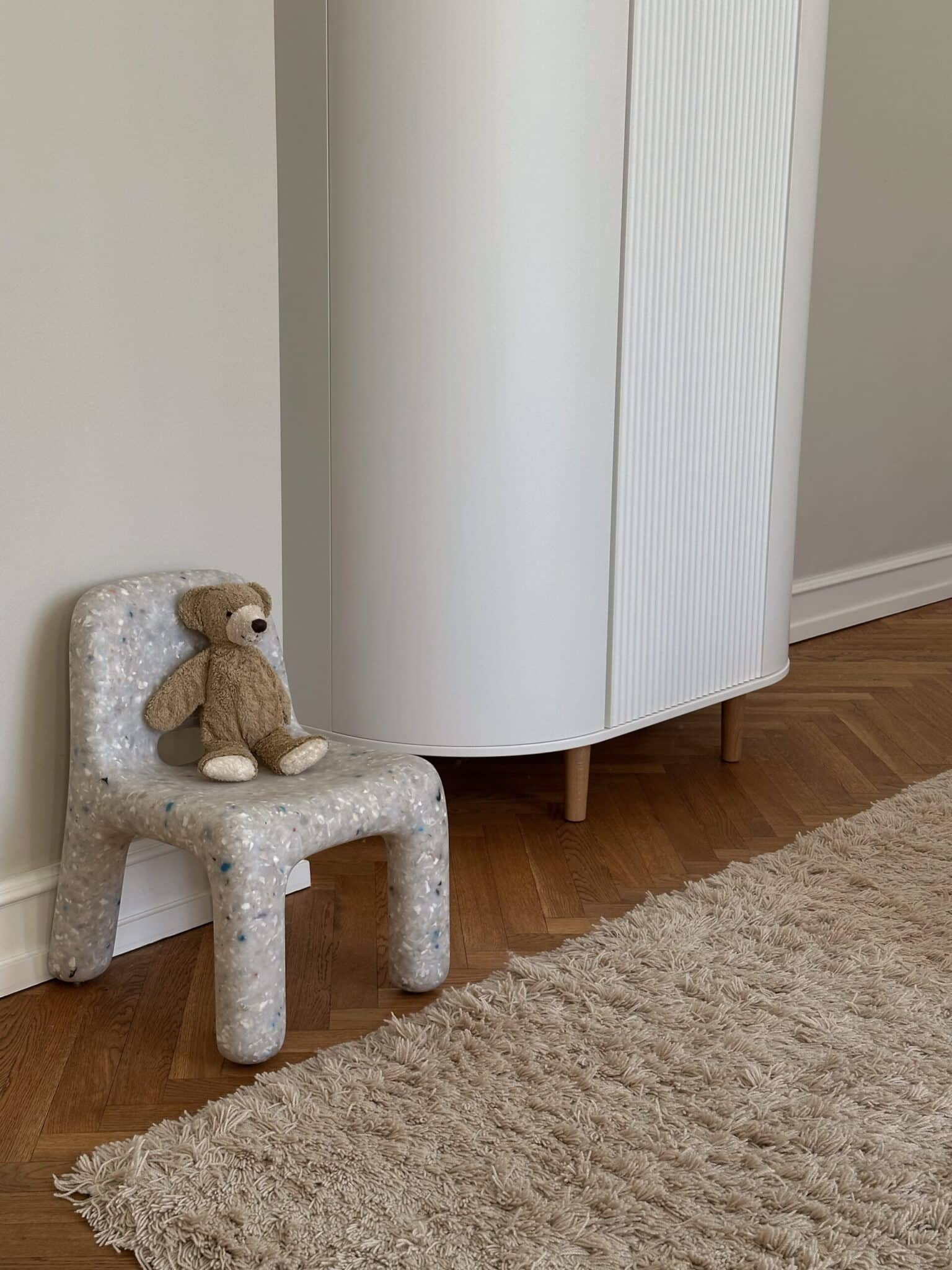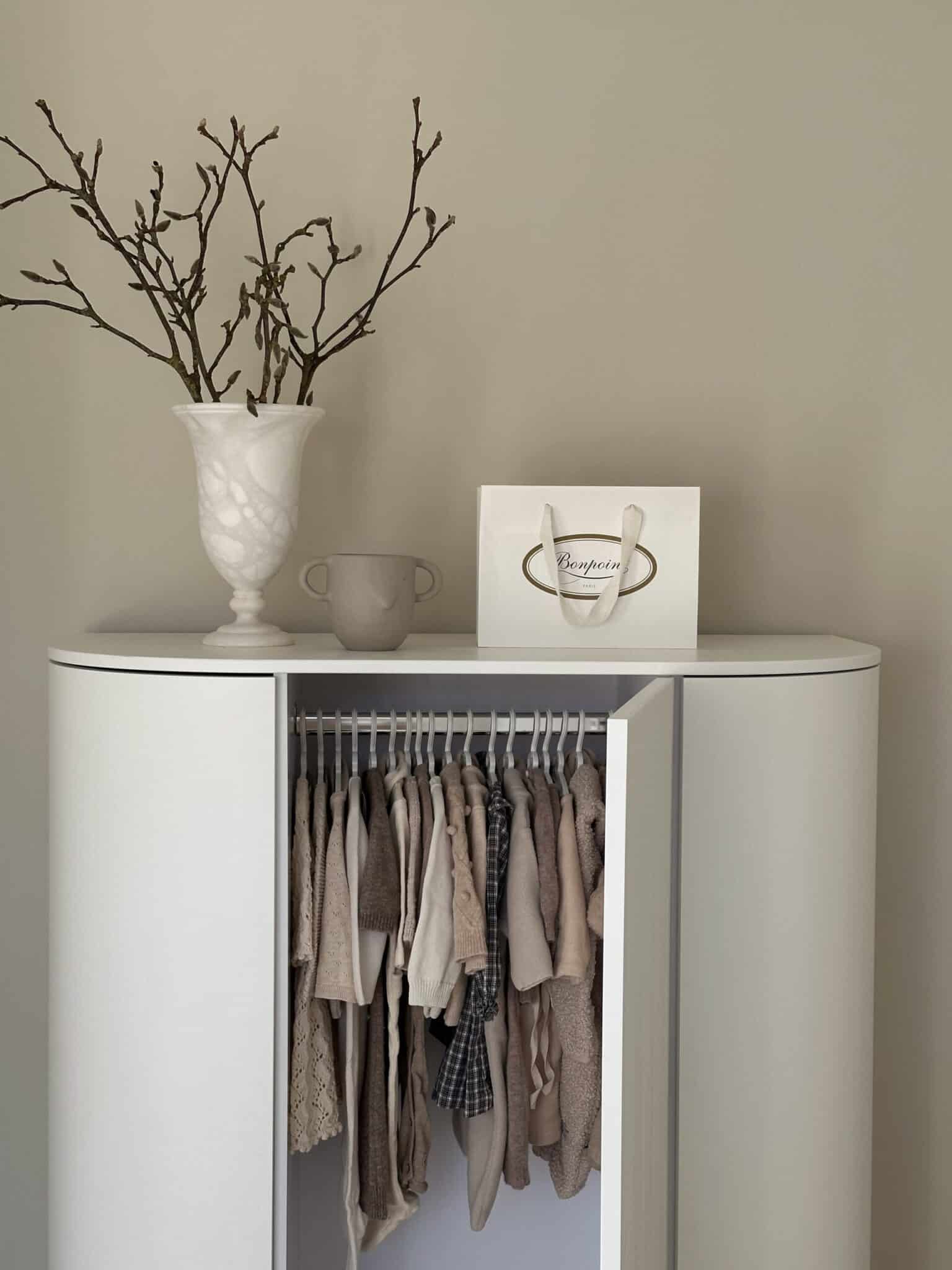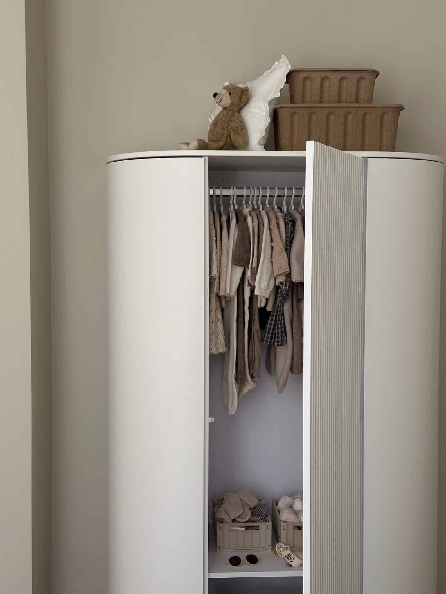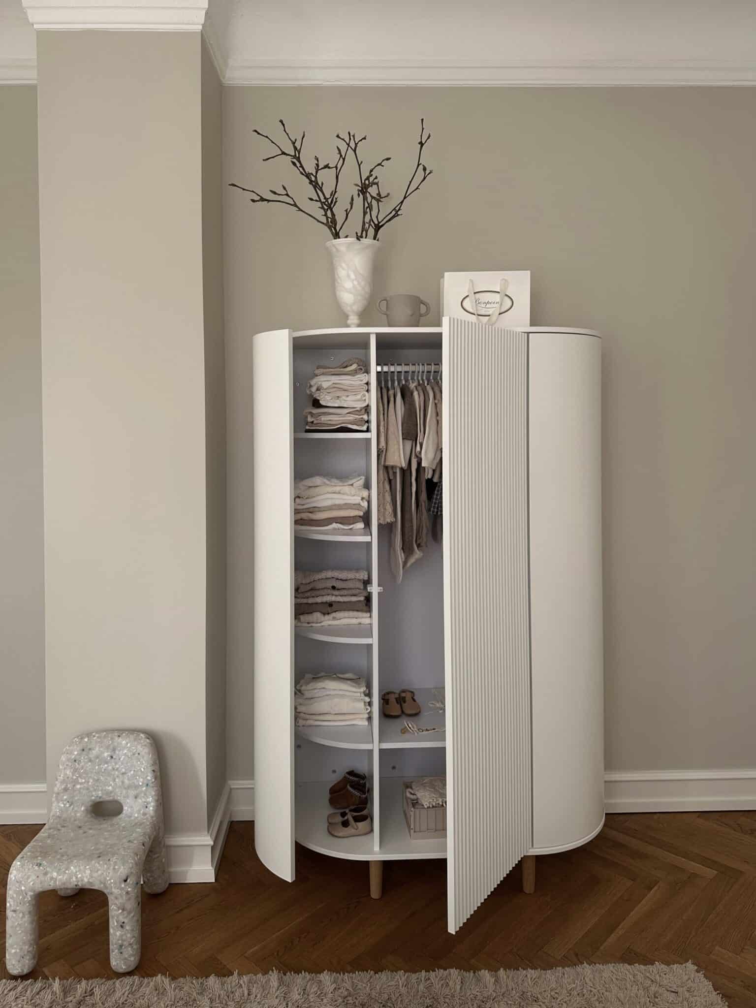 Dette elegante klædeskab kombinerer et ovalt udtryk med gennemtænkt funktionalitet, der gør det til en opbevaringsløsning, der kan bruges i generationer. Perfekt til børneværelset eller soveværelset, hvor det både skaber orden og elegance.